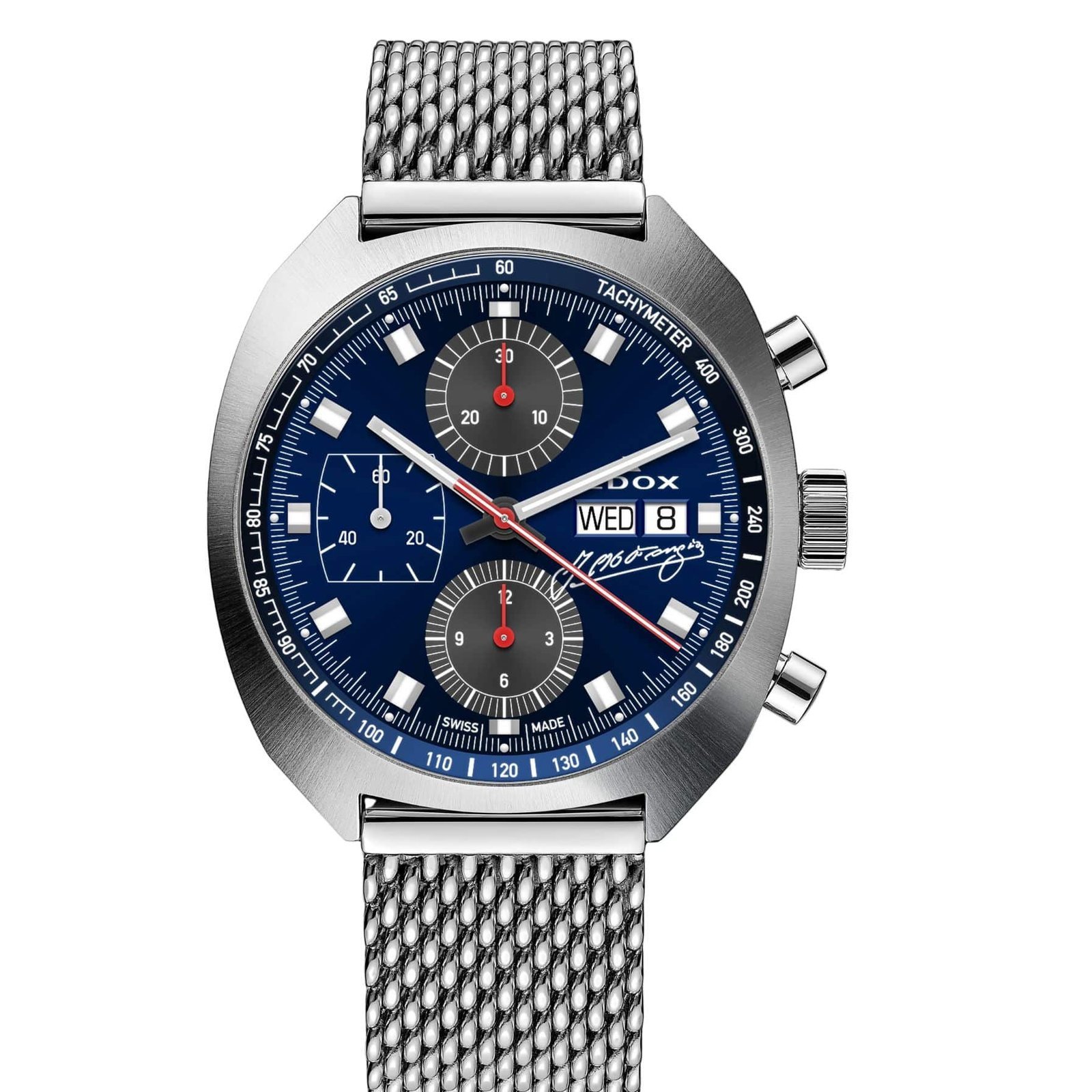 Funciones: Cronógrafo, segundero pequeño y taquímetro.