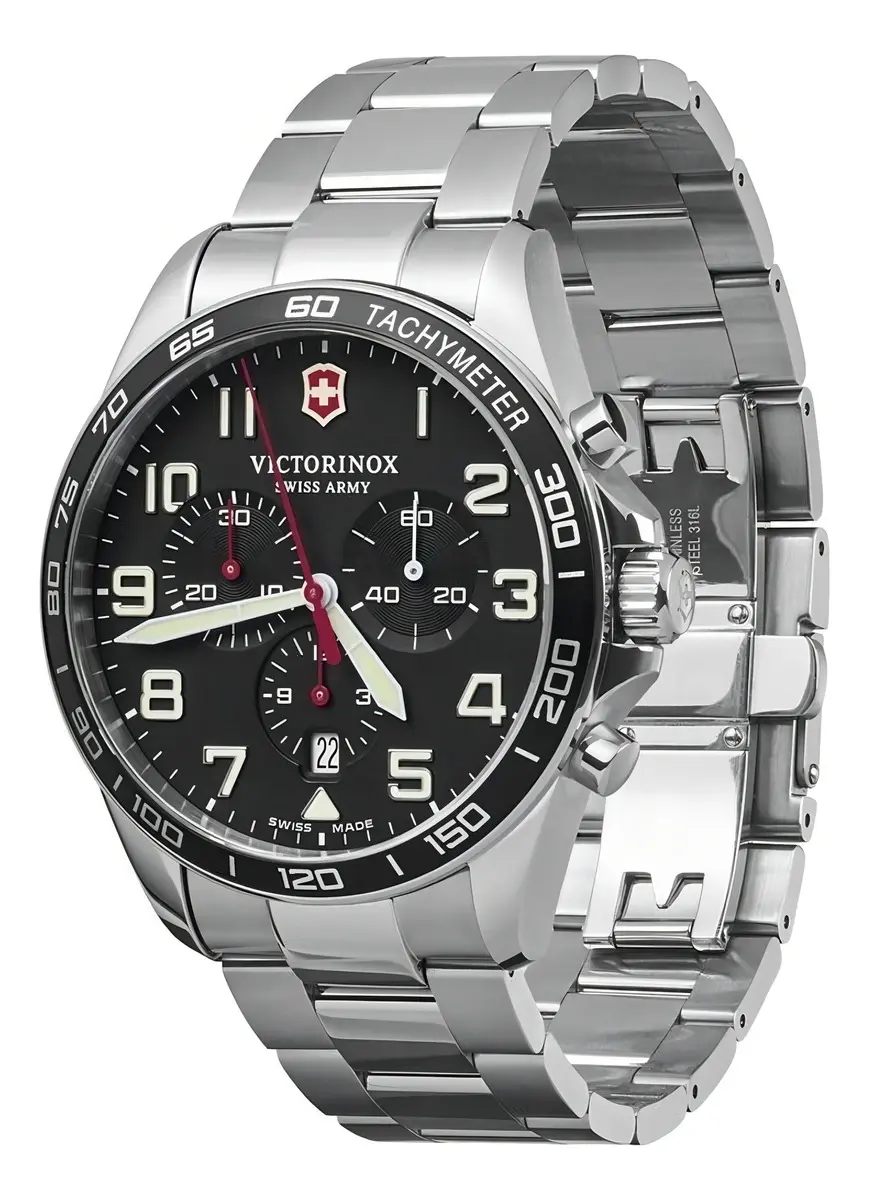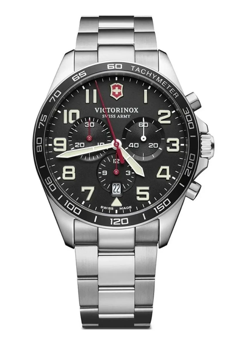 A la vanguardia de su campo, el indispensable Fieldforce Chrono cuenta con llamativos segunderos rojos con un contrapeso en forma de navaja suiza y una cruz roja y un escudo en la esfera. Ofrece una visibilidad diurna y nocturna inigualable gracias a la distintiva pantalla mejorada con Super-LumiNova®, así como funciones de cronógrafo y una escala taquimétrica, rindiendo homenaje a nuestras raíces con su nueva versión del diseño resistente y dinámico. Sepa dónde está y llegue a donde quiere estar con un reloj Fieldforce a su lado.