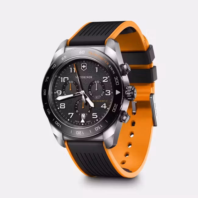 Atrévete a esforzarte con el reloj que se trata de forjar nuevas fronteras. Basado en su ADN de navaja suiza, este diseño mejorado es lujoso pero decididamente masculino. Los colores refinados y los índices curvos hacen una declaración de estilo, y los números llamativos y las manecillas de buen tamaño ofrecen una excelente legibilidad. La correa de piel flexible está rematada con una hebilla desplegable.